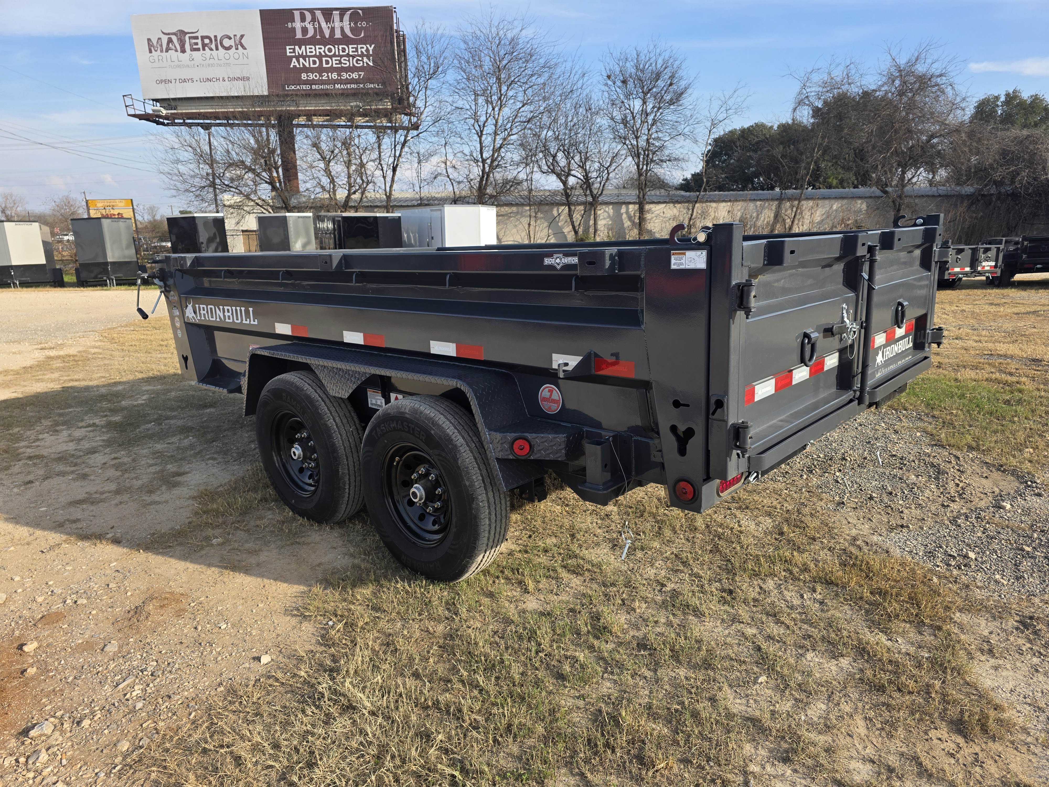 7 x 12 x 2 Iron Bull DWB Bumper Pull Dump, Low-Pro, 8in I-Beam Frame, Tarp, Scissor, Ramps, 7ga Fl. (Ranch Grey)