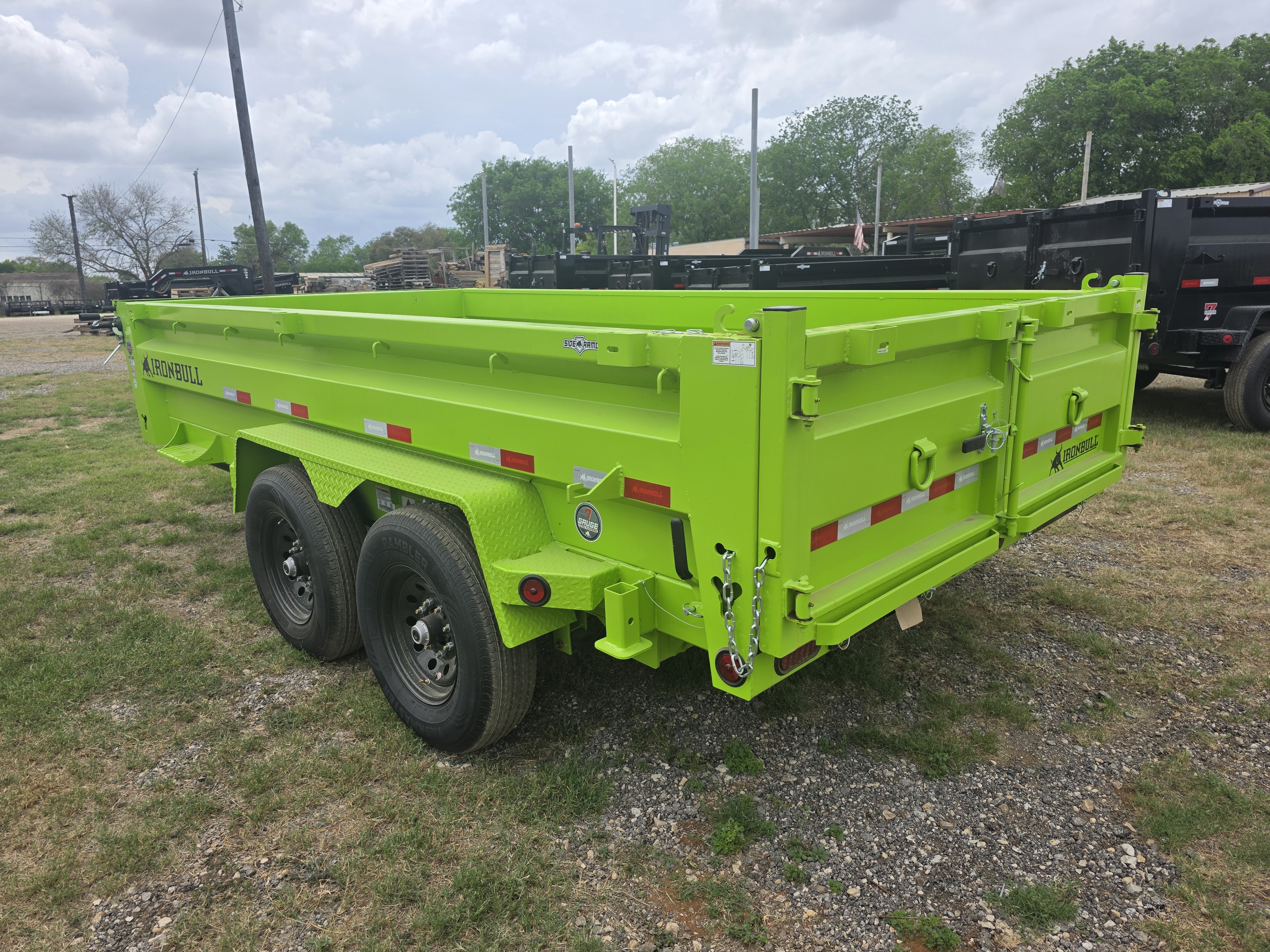 7 x 14 x 2 Iron Bull DWB Bumper Pull Dump, Low-Pro, 8in I-Beam Frame, Tarp, Scissor, Ramps, 7ga Fl. (Neon Safety Green)